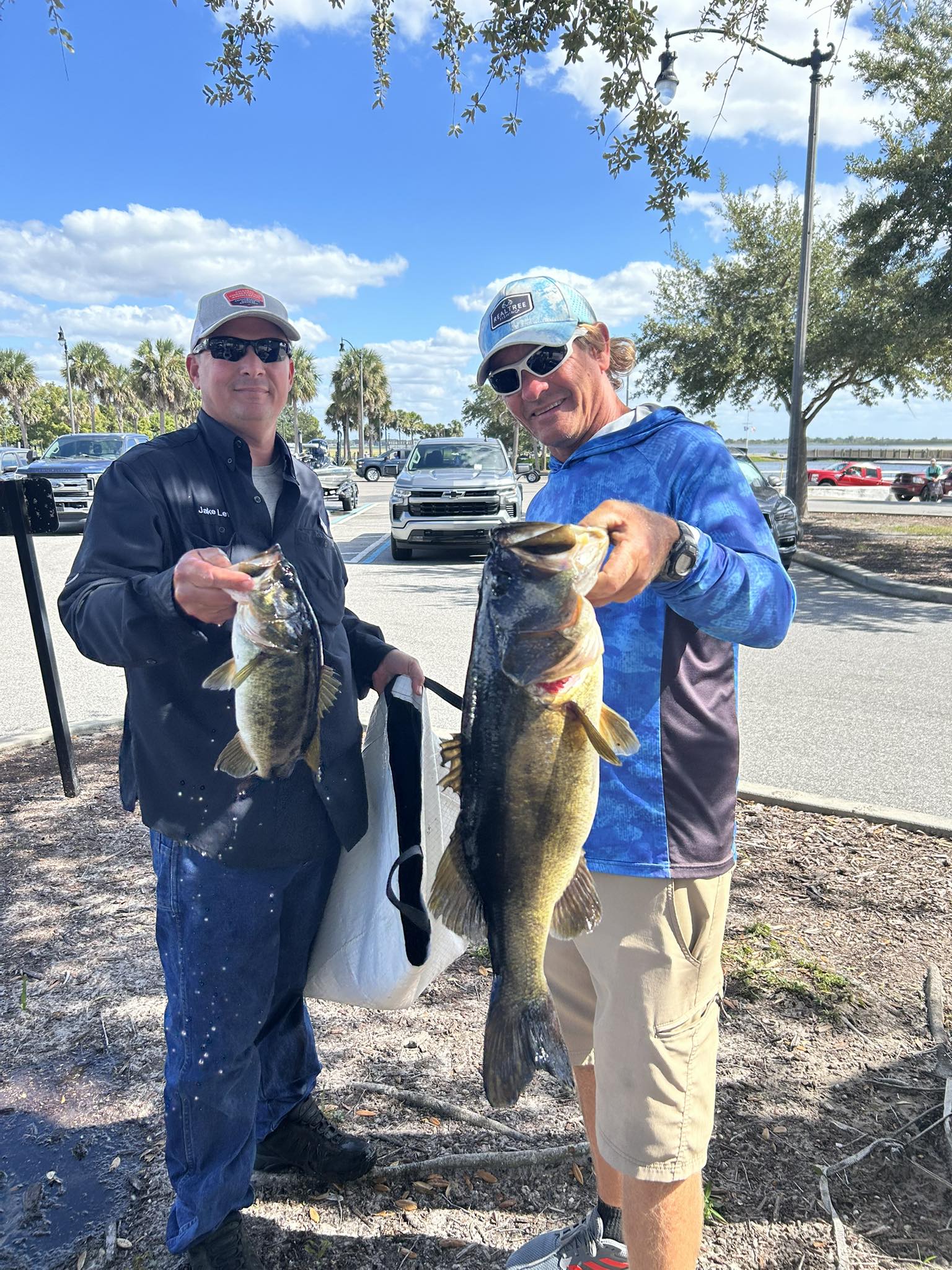 Gotta love November on Florida, Nice cool start, low humidity,sunny and warm day. Its a shame no one told the fish it was so beautiful out side. Alligator Lake was this months lake choice and she was not in a good mood. The fish were around but they were hard to get to bite and the big girls stayed hidden away. We sent out 25 boats and the anglers managed to catch 72 bass,14 limits,5 fish over 3 lbs &1 over 5lbs for a total of 99.96 lbs of fish. But as usual some teams do manage to find a few god one. Rounding out the money spots in 6th place was Jake Lewis & Matt Thortin with 7.92 lbs. Coming on 5th was Brandon Hagerott with 8.12 lbs, 4th went to Will & Amy Barnes with 8.74 lbs. Coming on 3rd was Vince Edwards & Dale Hayes with 9.66 lbs. 2nd went to Art & Kyle Arts with 11.24 lbs. Top Honors go to the brand new team of Dave Radebaugh & David Chillion with a nice nag on a tough day tipping the scales at 12.16 lbs. Congrats to all the winners.